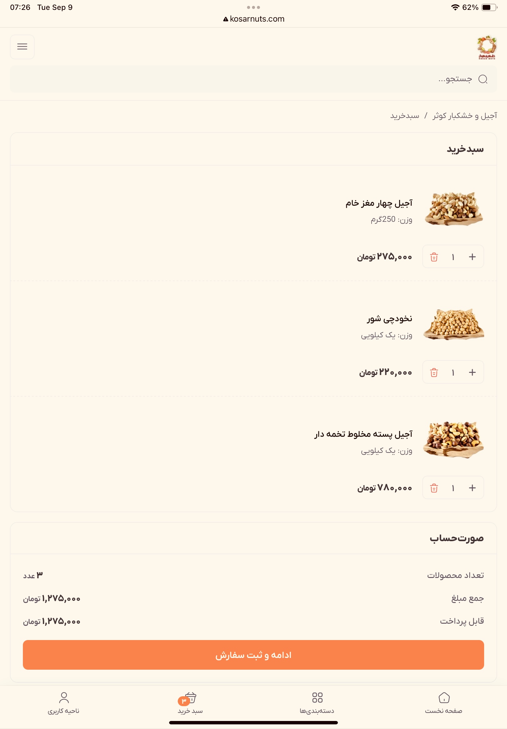 ۳. پس از انتخاب سایر اقلام، جهت تکمیل فرایند خرید ابتدا وارد بخش "مشاهده سبد خرید" شده و دکمه "ادامه و ثبت سفارش" را فشار دهید.