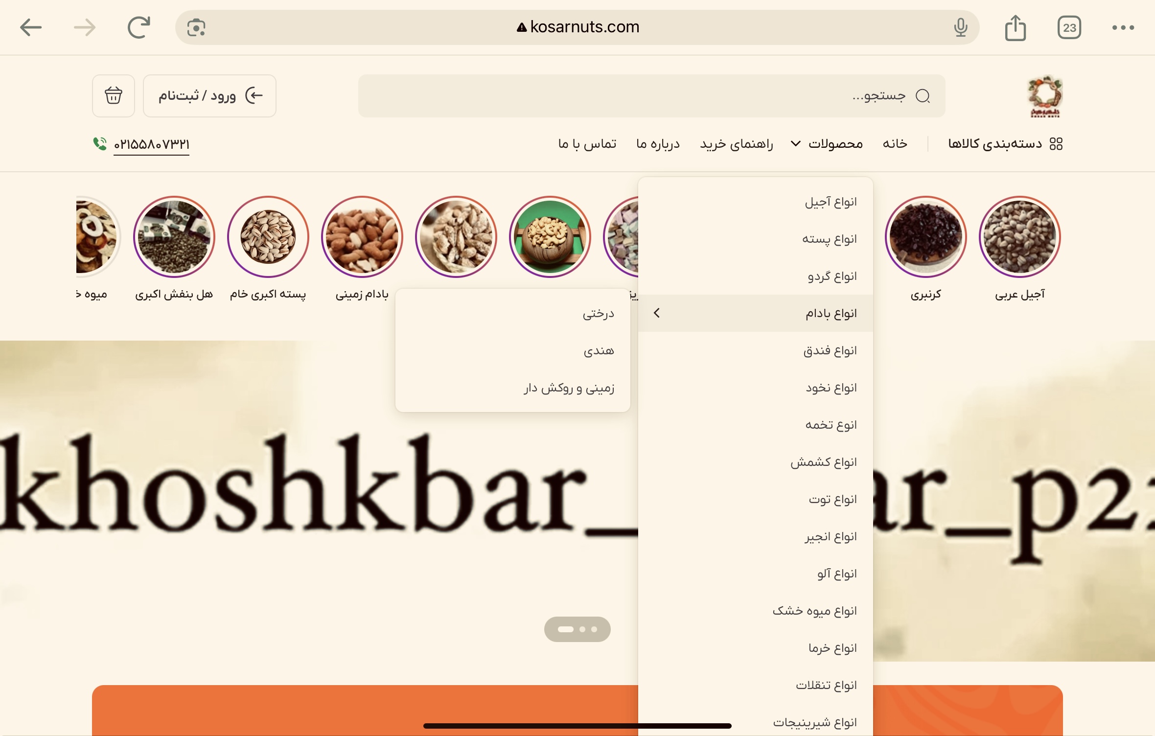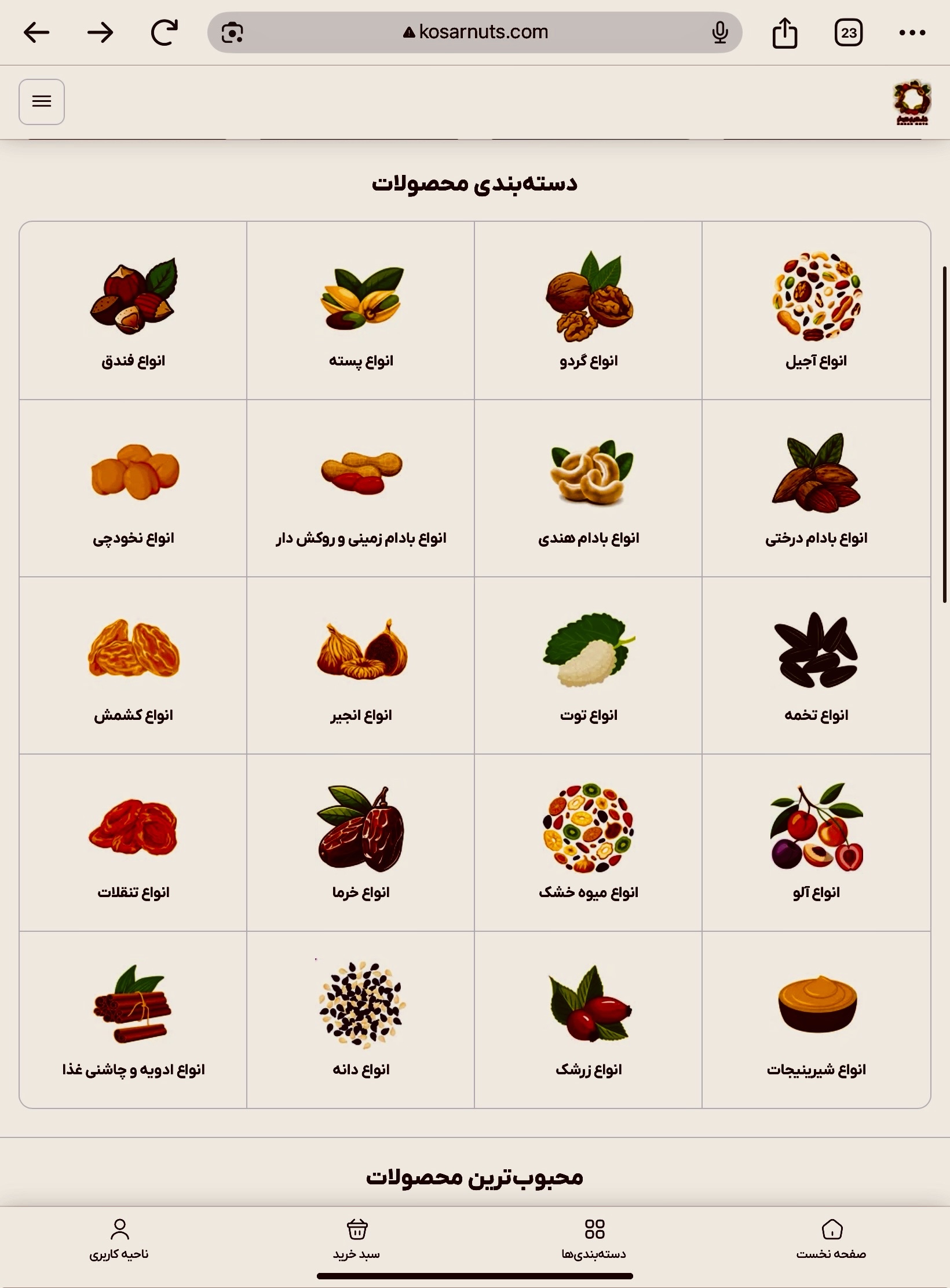 ۱. پس از ورود به وب سایت مجموعه، ابتدا از منوی نواری بالای صفحه و یا بخش دسته بندی محصولات در میانه صفحه نسبت به انتخاب دسته محصول مورد نظر اقدام نمایید.